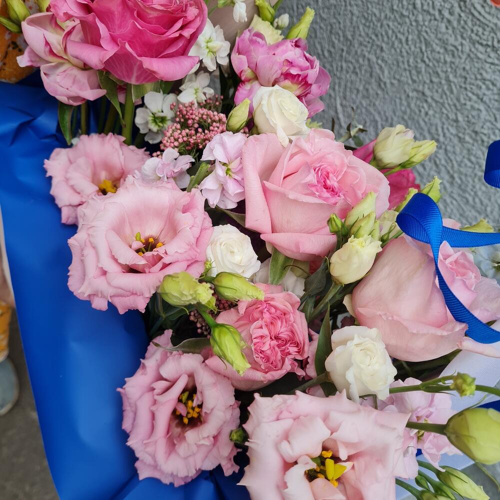 Пион Сара Бернар – 2 шт.эустома махровая розовая – 4 шт.Диантус сортовой – 1 шт.Дельфиниум голубой – 1 шт.маттолла – 3 шт.момоко хризантема – 2 шт.country blues – 2 шт.white o’hara – 3 шт.
