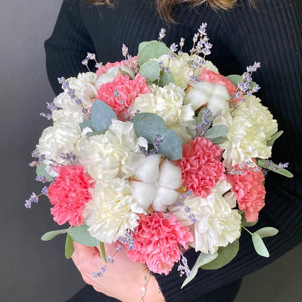 «Лавандовое созвездие» Букет из розы, гвоздики, статица и хлопка