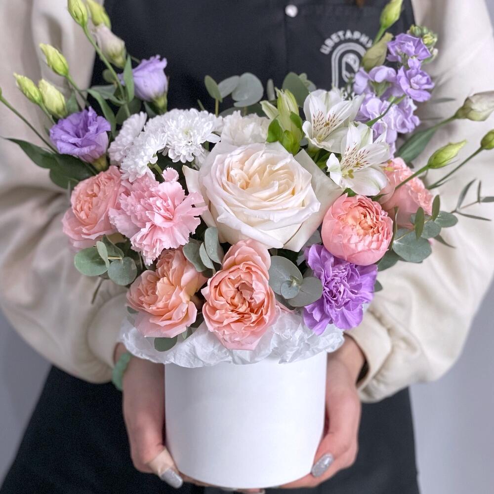 кустовые пионовидные розы – 2 шт.Лизиантус – 1 шт.Маттиола – 1 шт.Пионовидная роза – 1 шт.Альстромерия – 1 шт.Гвоздика – 3 шт.Сантини – 1 шт.шляпная коробка с надписью – 1 шт.