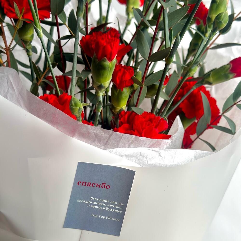 Кустовые красные гвоздики с эвкалиптом к 9 мая