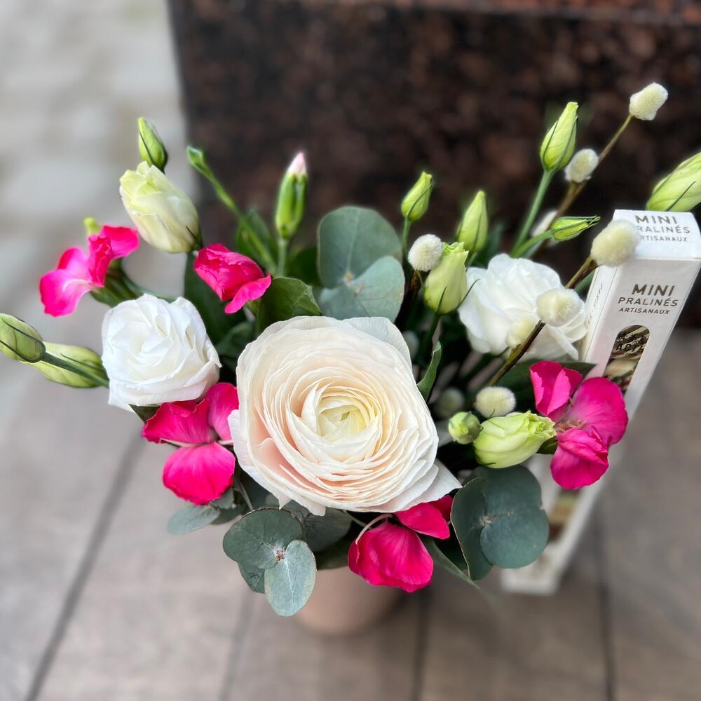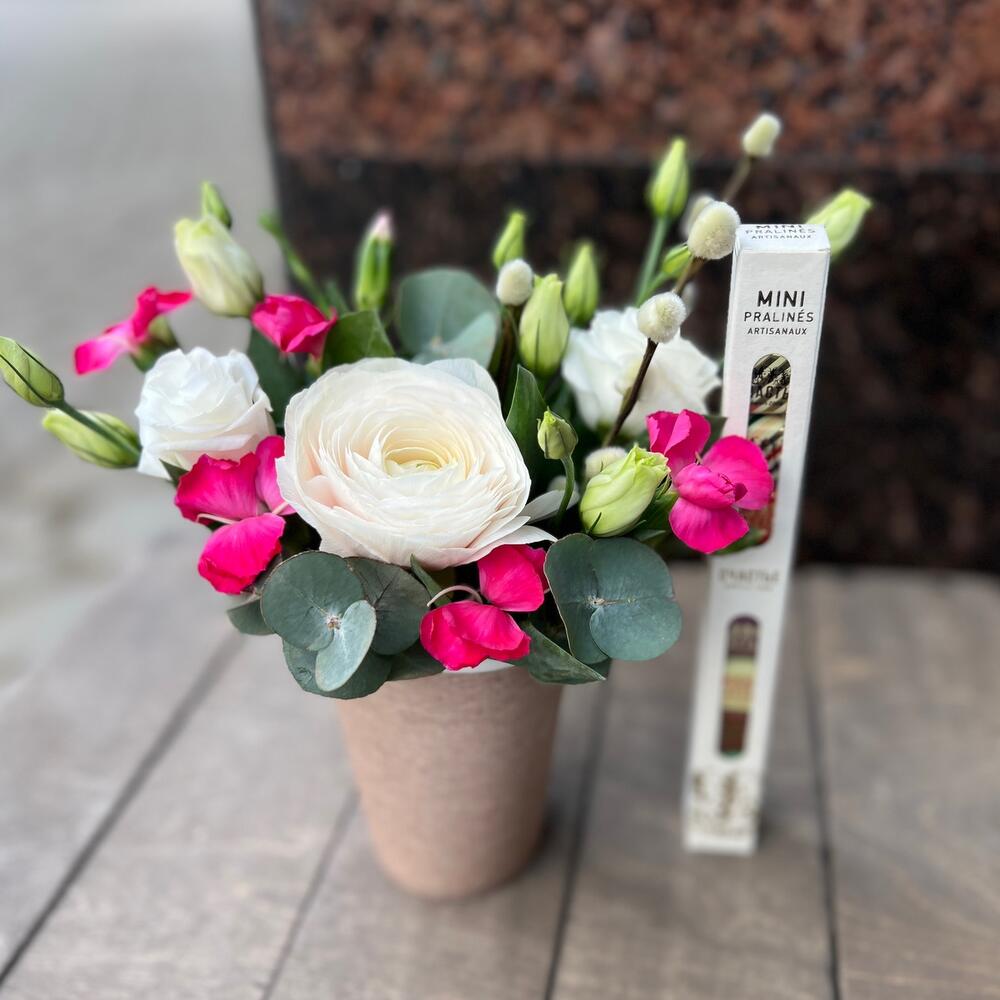 Лизиантус – 1 шт.Эвкалипт – 1 шт.Ранункулюс – 1 шт.Оазис флористический – 1 шт.стакан кофейный – 1 шт.шоколад счастье – 1 шт.соломиа гвоздика – 2 шт.