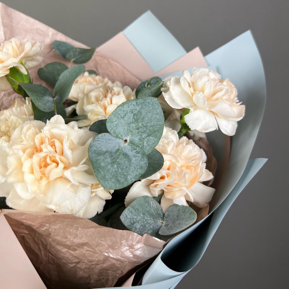 Тишью – 1 шт.Калька – 1 шт.Эвкалипт ценерея – 3 шт.Кремовая гвоздика – 11 шт.