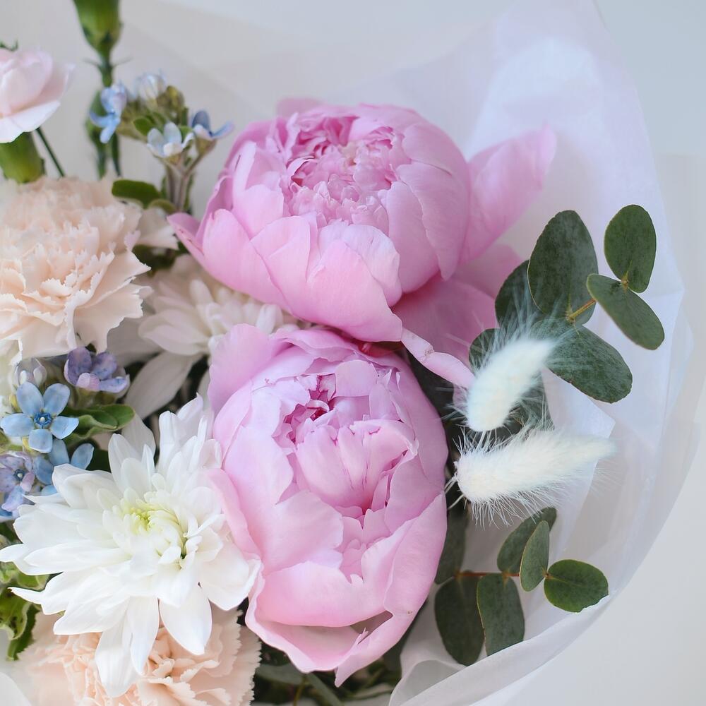 Пион – 3 шт.Оксипеталум – 4 шт.Хризантема кустовая – 1 шт.диантус брют – 2 шт.Диантус кустовой – 1 шт.эвкалипт цинерея пучок – 1 шт.зелень техническая пучок – 1 шт.Упаковка дизайнерская – 1 шт.подкормка для срезанных цветов – 1 шт.Лагурус – 3 шт.