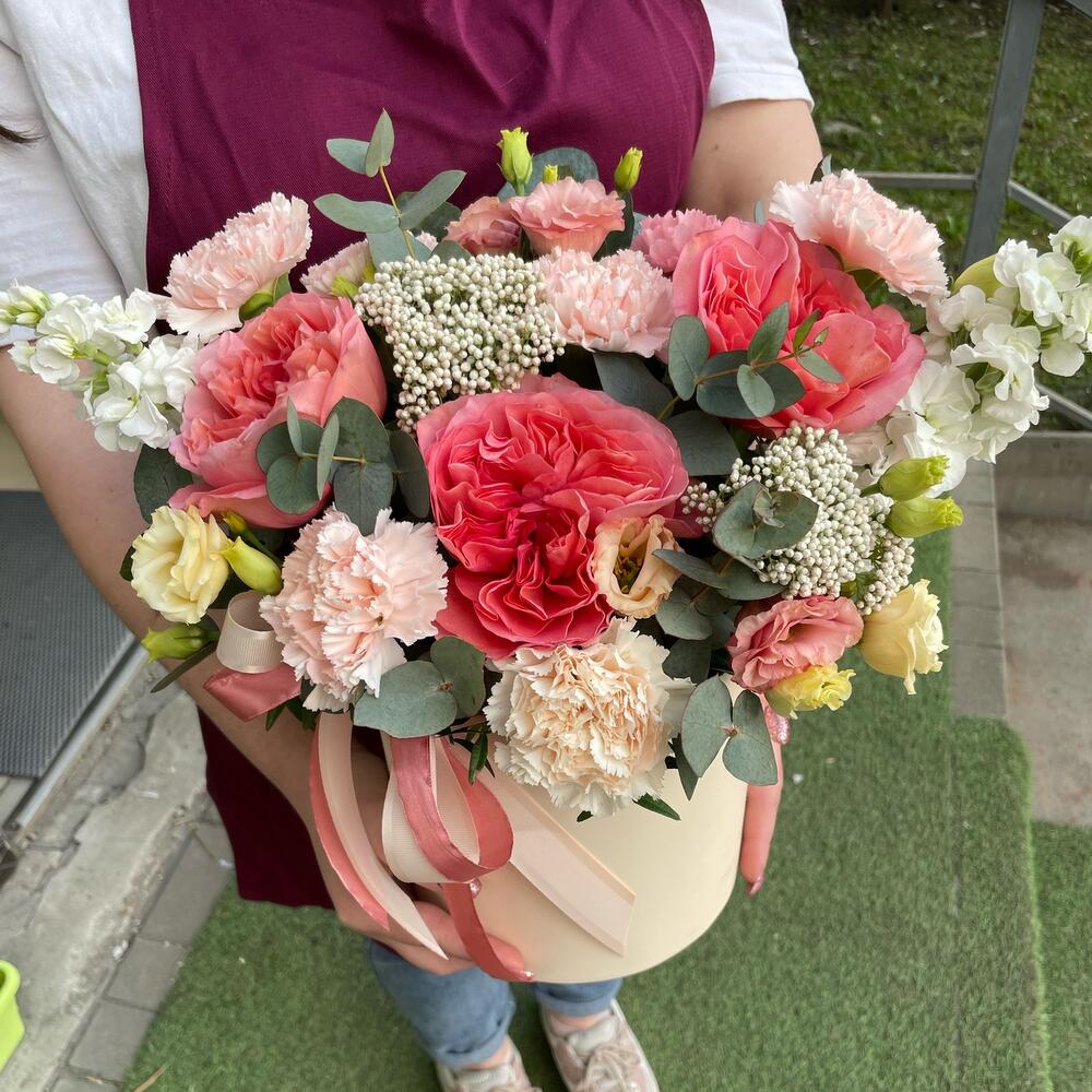 Маттиола – 2 шт.Озотамнус – 2 шт.Эвкалипт – 3 шт.Эустома – 4 шт.Лента атласная – 2 шт.Диантус – 5 шт.Коробка шляпная – 1 шт.Оазис флористический – 1 шт.розы – 3 шт.
