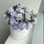 Шляпная коробка с лавандовой гвоздикой и эвкалиптом, 25 см в диаметре и 35 см высотой