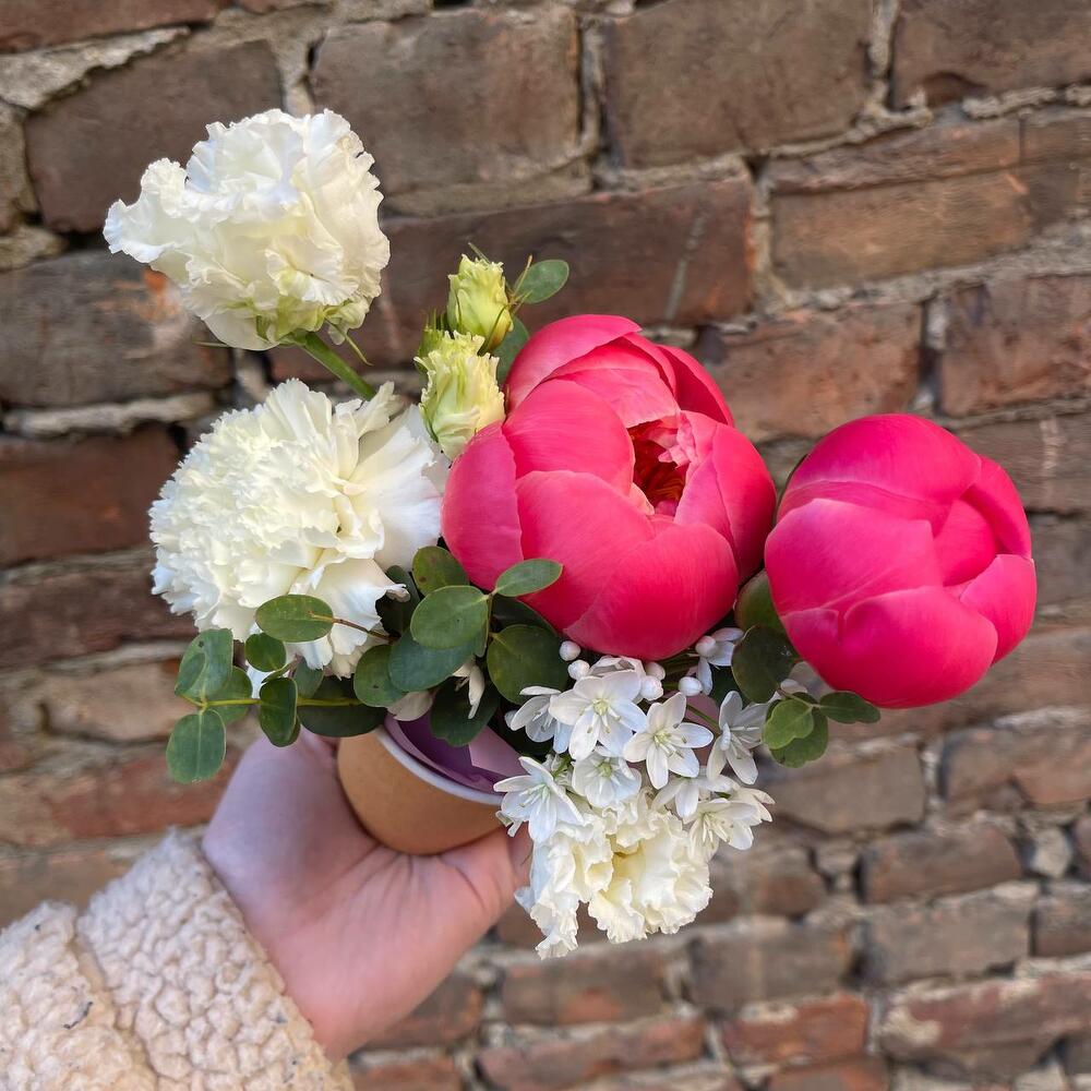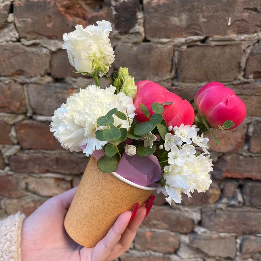 Лизиантус – 1 шт.Пион – 2 шт.Эвкалипт – 1 шт.Гвоздика – 1 шт.Губка флористическая – 1 шт.стакан крафт – 1 шт.