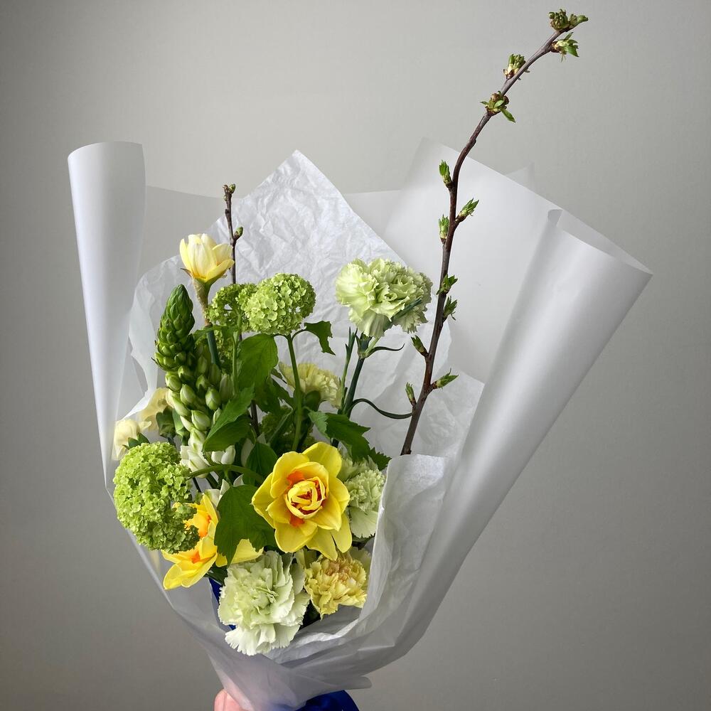 Вибурнум – 1 шт.Нарцисс – 3 шт.Гвоздика – 5 шт.Орнитогалум – 1 шт.Гвоздика кустовая – 1 шт.Прунус – 2 шт.