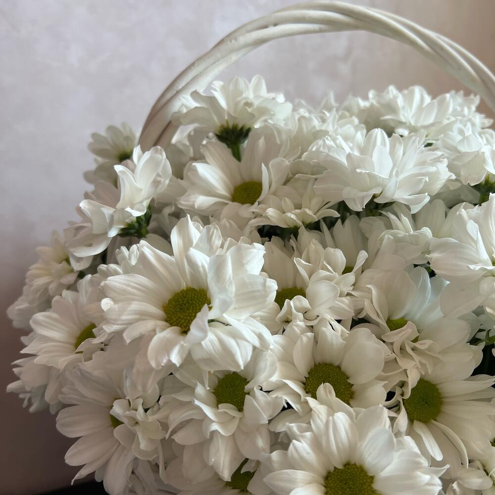 кустовая хризантема ромашка – 30 шт.Флористическая губка (оазис) – 1 шт.плетенная корзина l – 1 шт.Атласная лента – 1 шт.