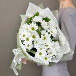 Фисташка – 3 шт.Лента атласная – 1 шт.Упаковка дизайнерская – 1 шт.Хризантема Кустовая Бакарди белая – 5 шт.Тишью белое – 1 шт.