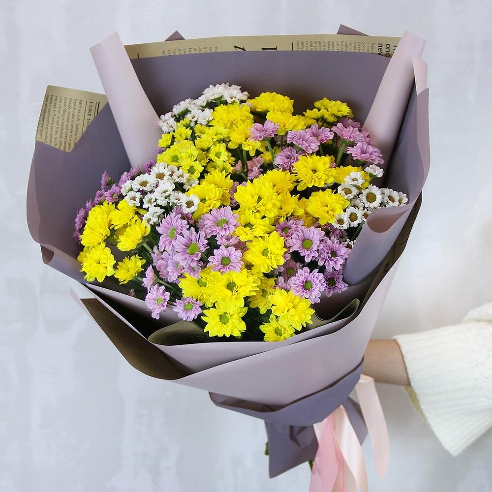 Букет из 15 кустовых хризантем Сантини микс в стильной упаковке