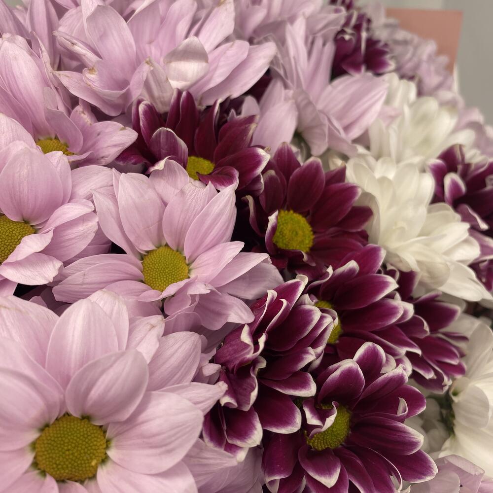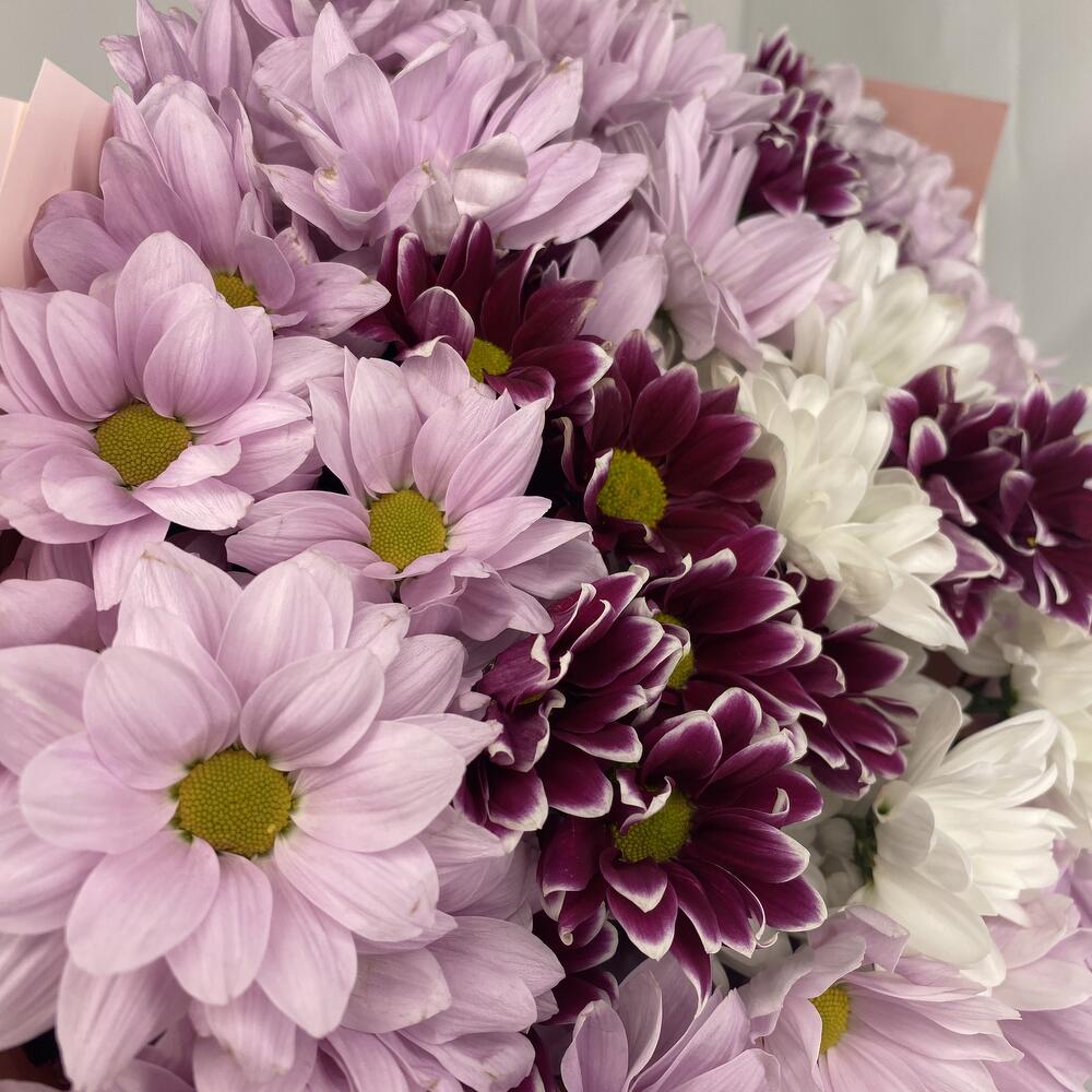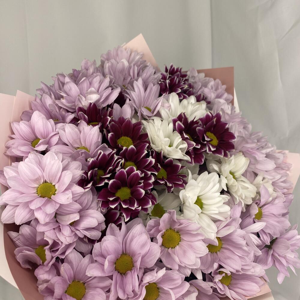 кустовая хризантема ромашковидная – 17 шт.Упаковка – 3 шт.Атласная лента – 1 шт.
