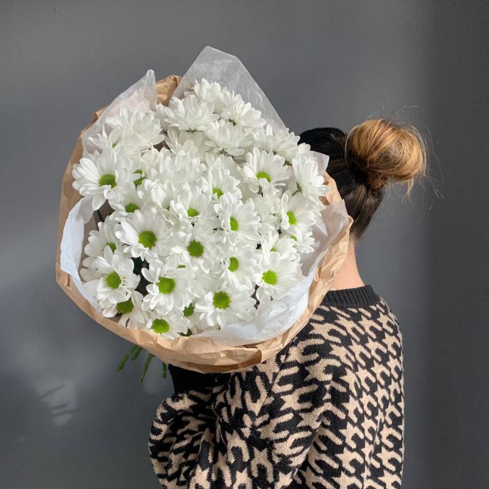 Букет из 7 белых кустовых хризантем в стильной упаковке