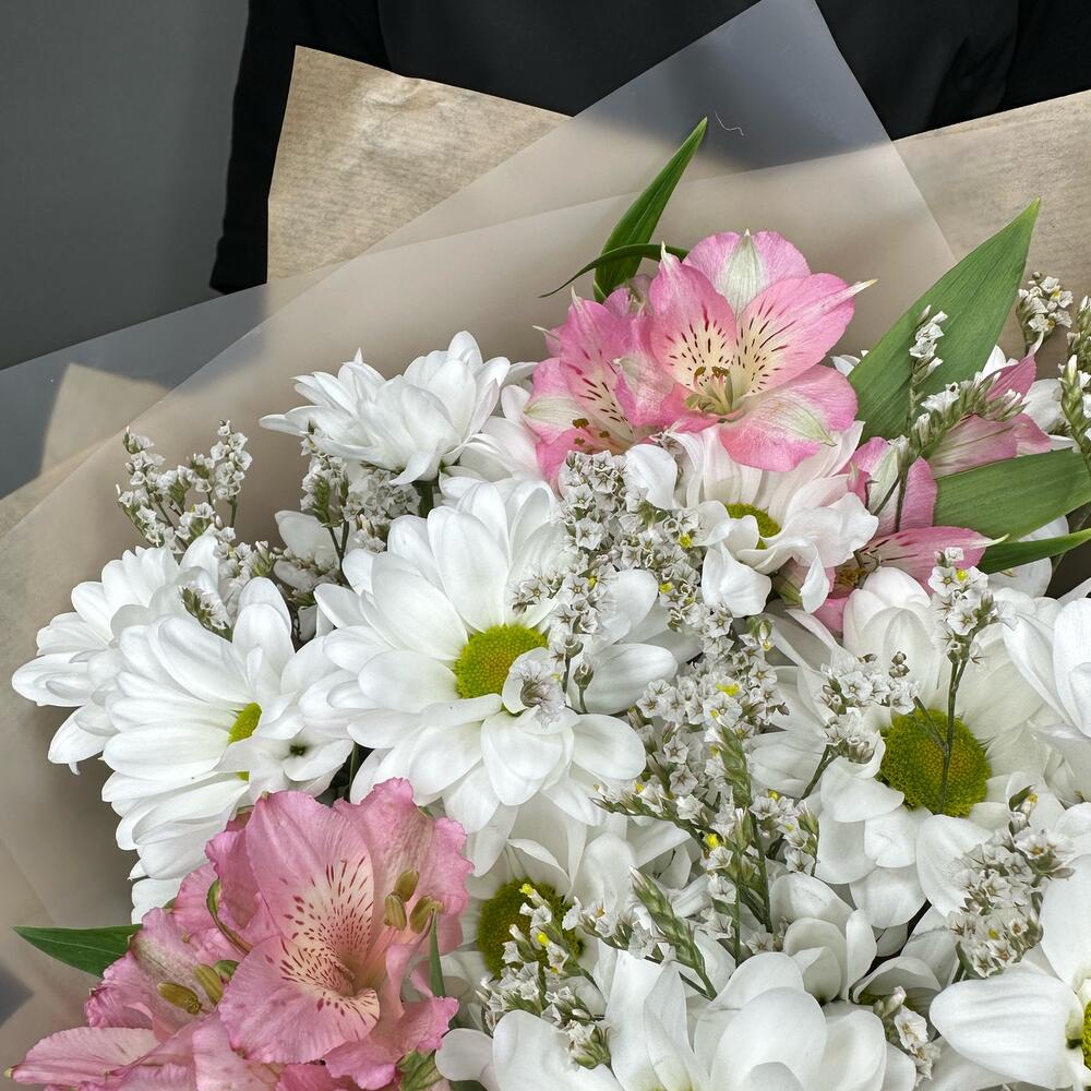 Хризантема кустовая ромашковая – 4 шт.Альстромерия – 3 шт.Лимониум – 1 шт.Упаковка дизайнерская – 1 шт.Лента атласная – 1 шт.