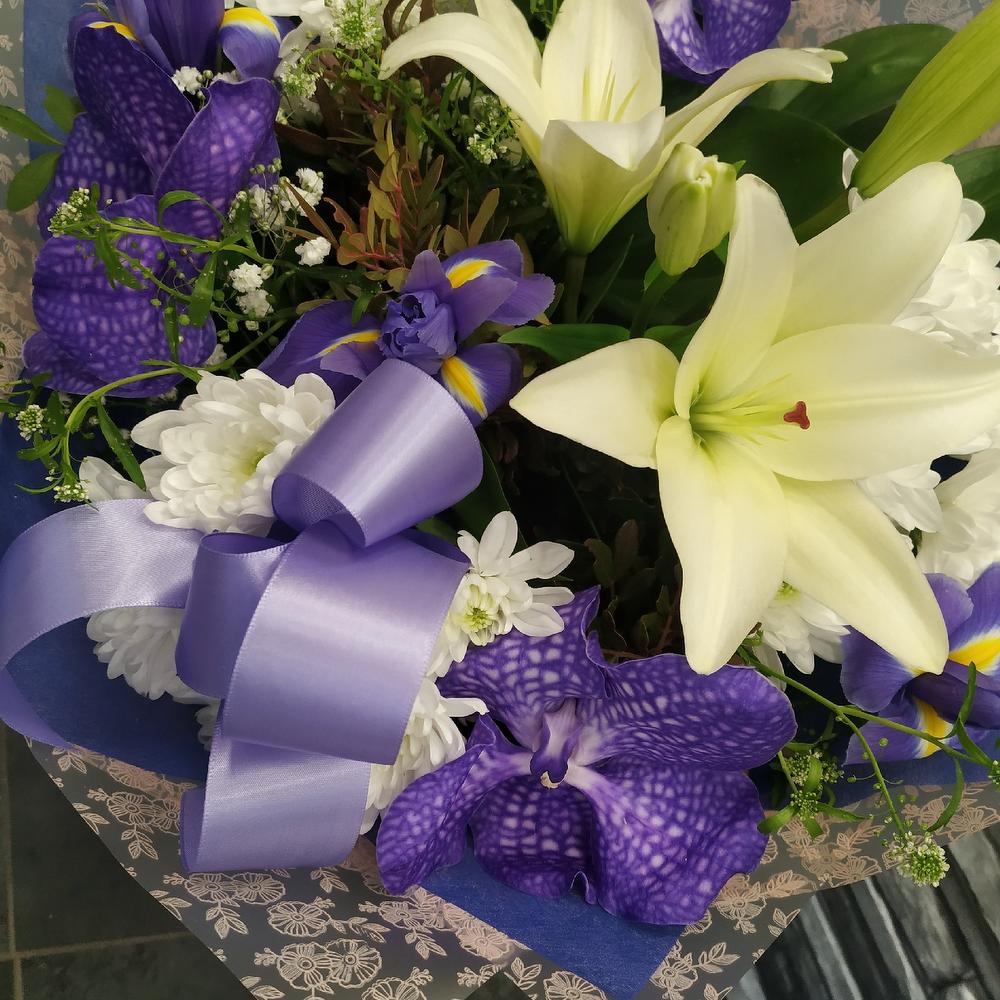 Орхидея Ванда – 3 шт.Хризантема кустовая – 3 шт.Азиатская лилия – 1 шт.Ирис – 3 шт.Фисташка – 1 шт.Зелень – 1 шт.Упаковка дизайнерская – 1 шт.Лента атласная – 1 шт.Гринбелл – 1 шт.Гипсофила – 1 шт.