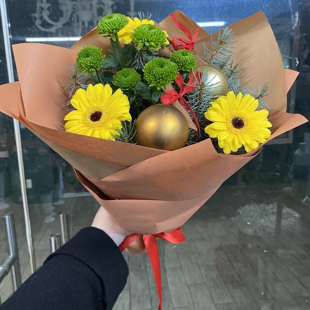 Гербера – 3 шт. Ель – 1 шт. Упаковка дизайнерская – 1 шт. хризантемы кустовые – 1 шт. инрушки новогодние – 3 шт.