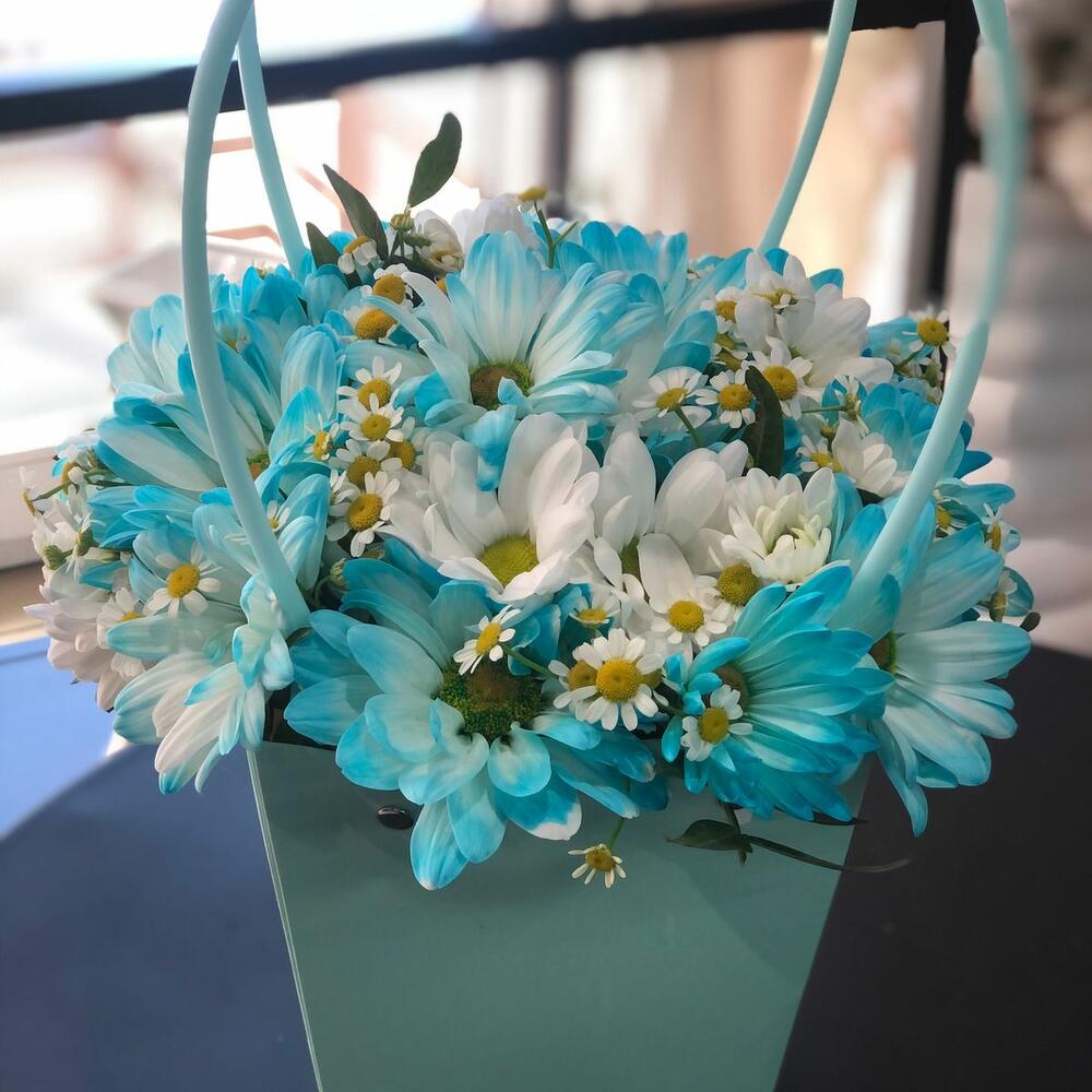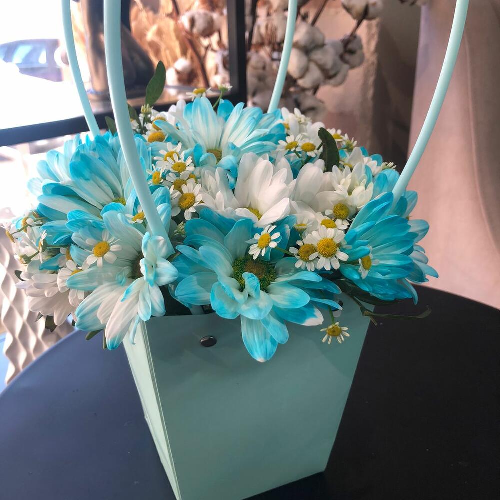 Кустовая хризантема – 2 шт.Танацетум – 2 шт.Оазис – 1 шт.Плайм пакет – 1 шт.