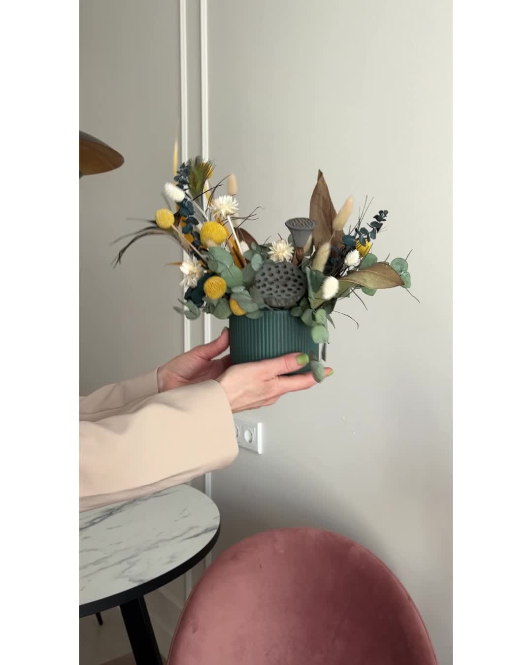 Композиция из сухоцветов и стабилизированных цветов жёлто - изумрудная