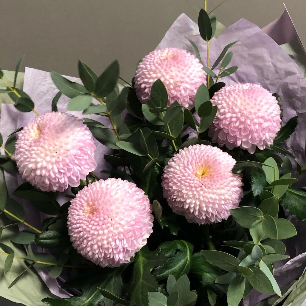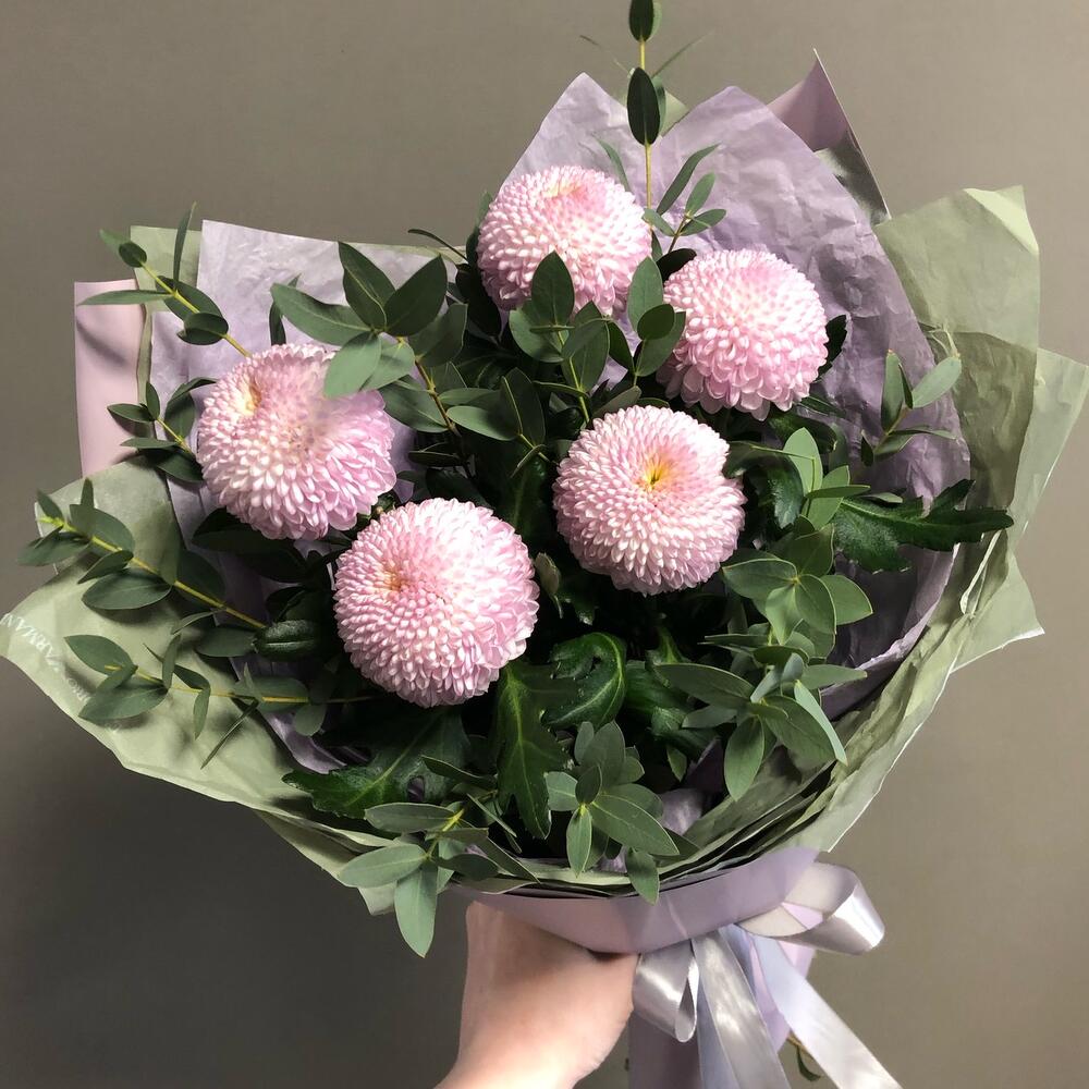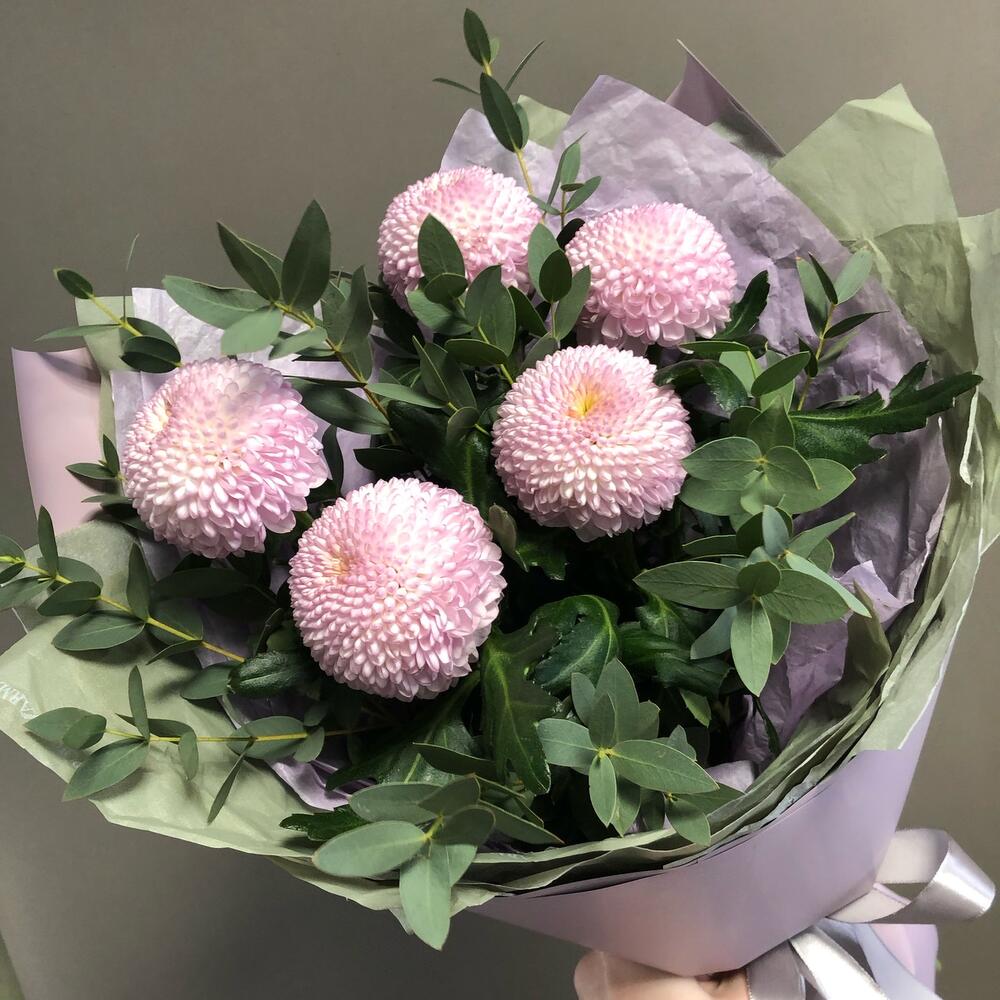Лента атласная – 1 шт.Тишью – 6 шт.Хризантема момоко – 5 шт.Пленка дизайнерская – 3 шт.эвкалипт итальянский – 5 шт.