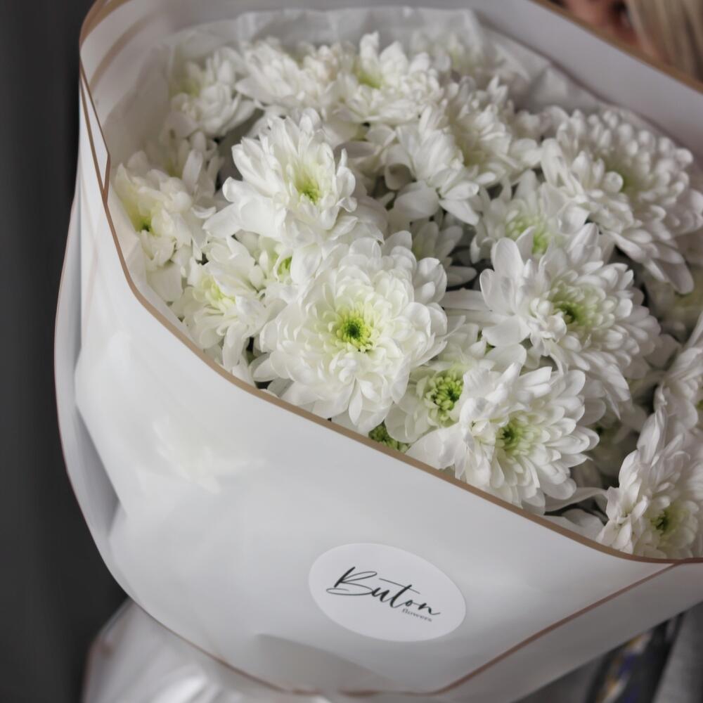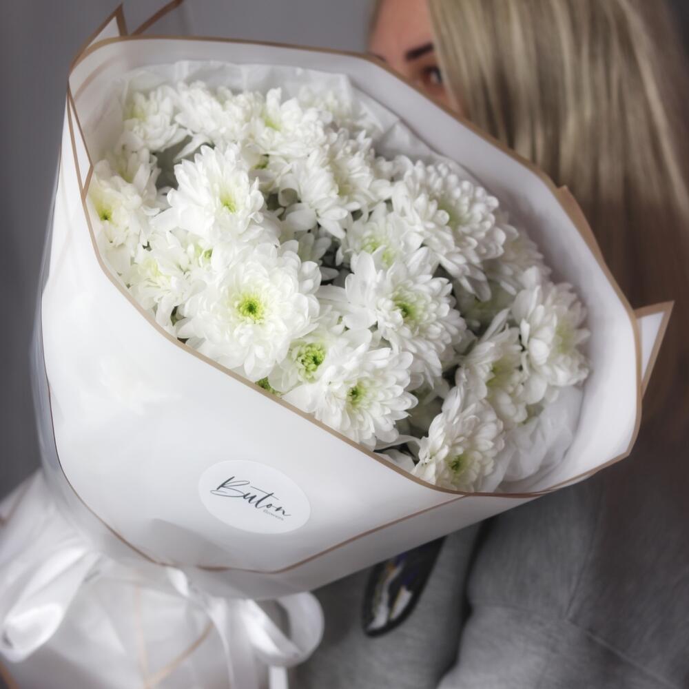 Хризантема кустовая – 7 шт.Открыточка с вашими пожеланиями – 1 шт.Шоколадка – 1 шт.Дизайнерская упаковка – 1 шт.