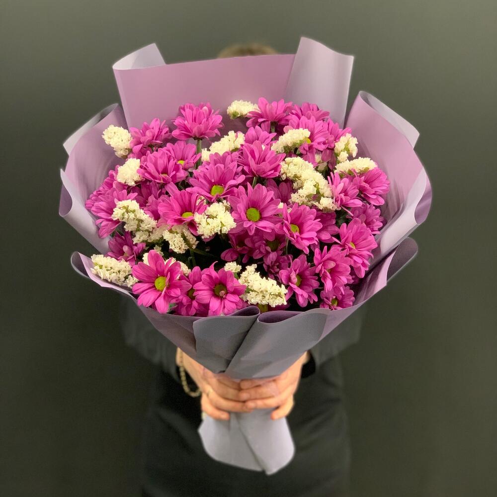 Хризантема кустовая – 7 шт.Статица – 2 шт.Упаковка дизайнерская – 1 шт.