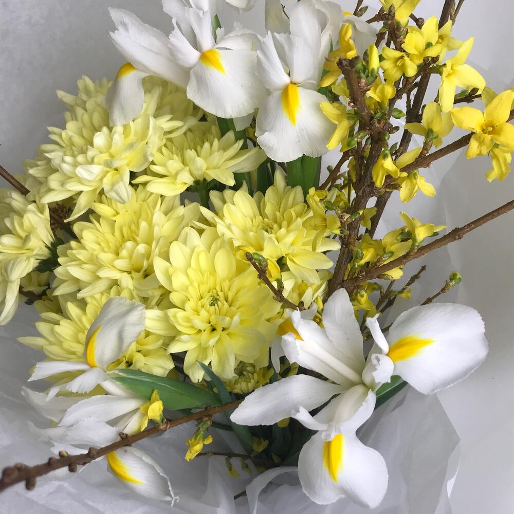 Форзиция – 4 шт.Ирис белый – 5 шт.хризаентема кустовая – 3 шт.