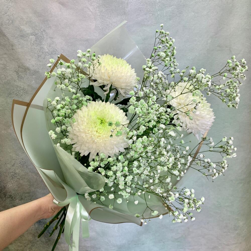 Хризантема магнум – 3 шт.Гипсофила – 3 шт.Рускус – 2 шт.Упаковка дизайнерская – 2 шт.