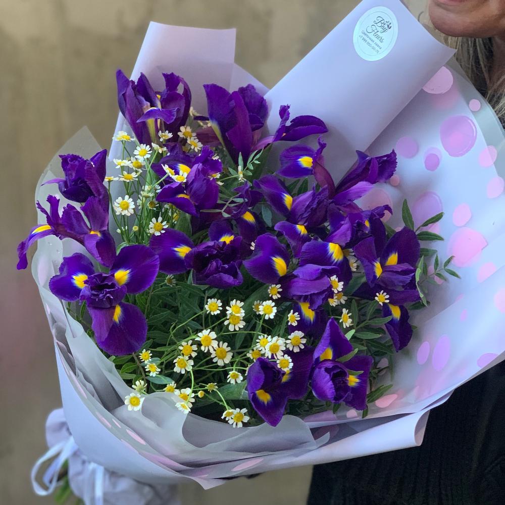 Ирис – 15 шт.Матрикария – 2 шт.Фисташка – 5 шт.Упаковка дизайнерская – 1 шт.Лента атласная – 1 шт.
