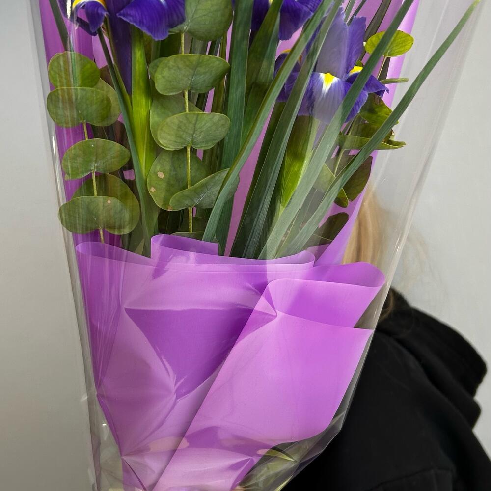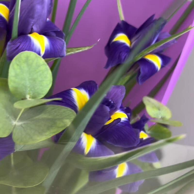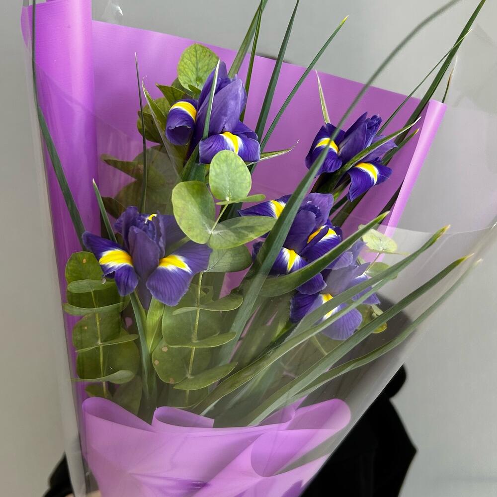 Букет из ярких ирисов и ароматного эвкалипта