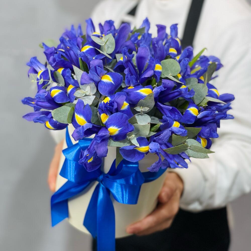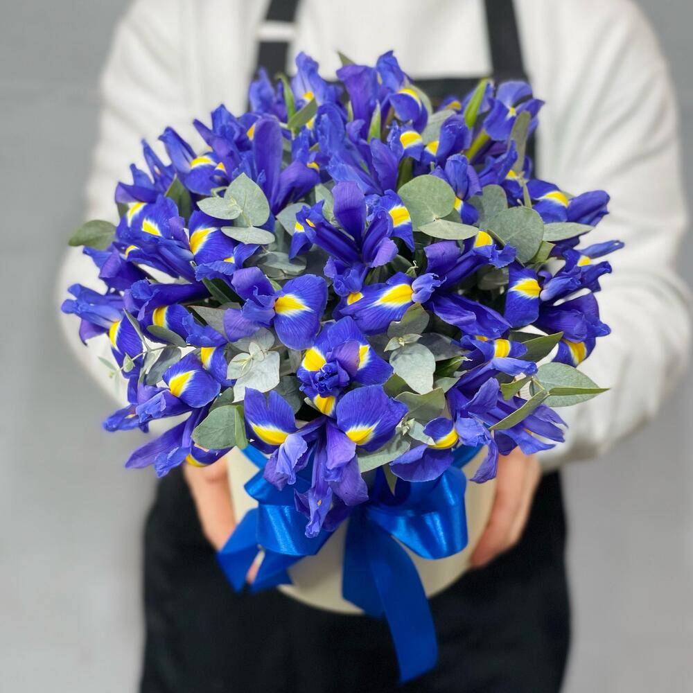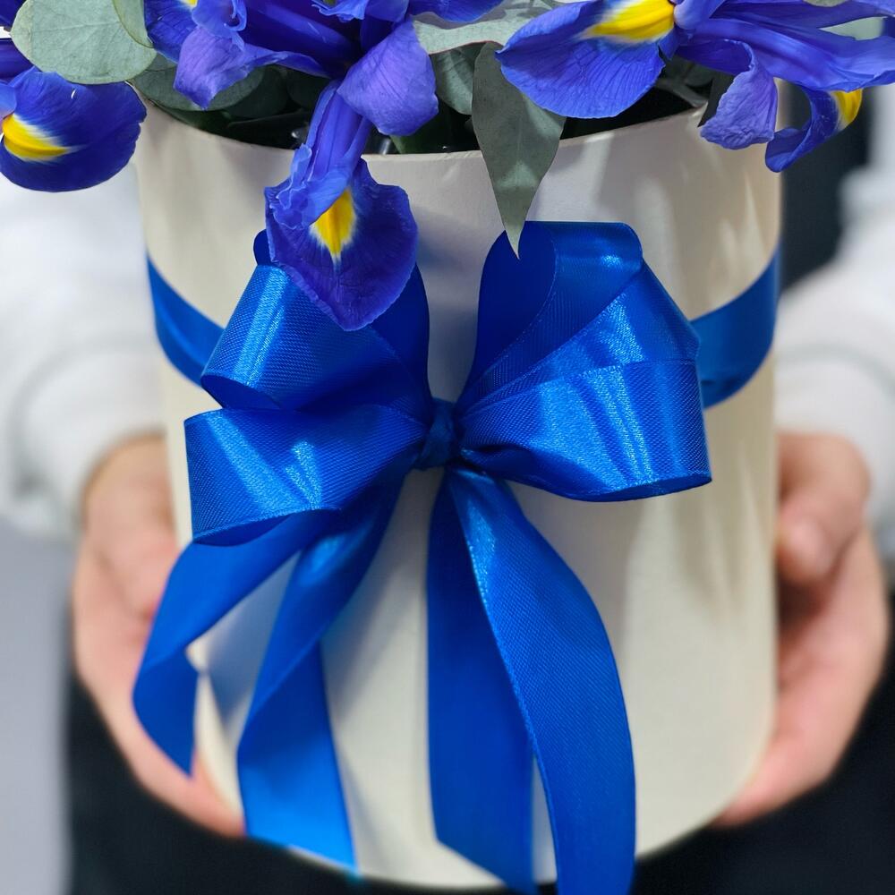 Эвкалипт – 3 шт.Лента атласная – 1 шт.Шляпная коробка – 1 шт.Ирис Blue Magic – 19 шт.Флористическая губка – 1 шт.