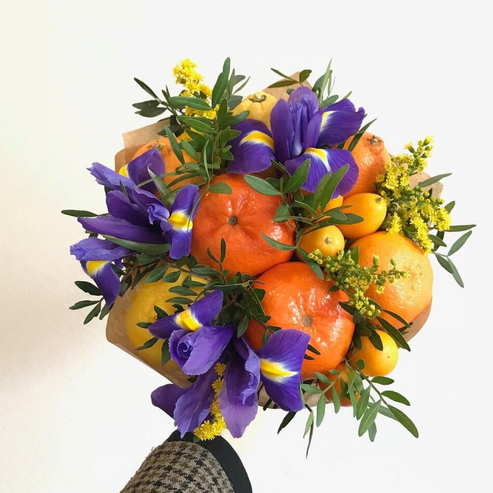 мандарины – 300 гр.лимоны – 200 гр.Кумкват – 100 гр.ирисы – 3 шт.содидаго – 3 шт.