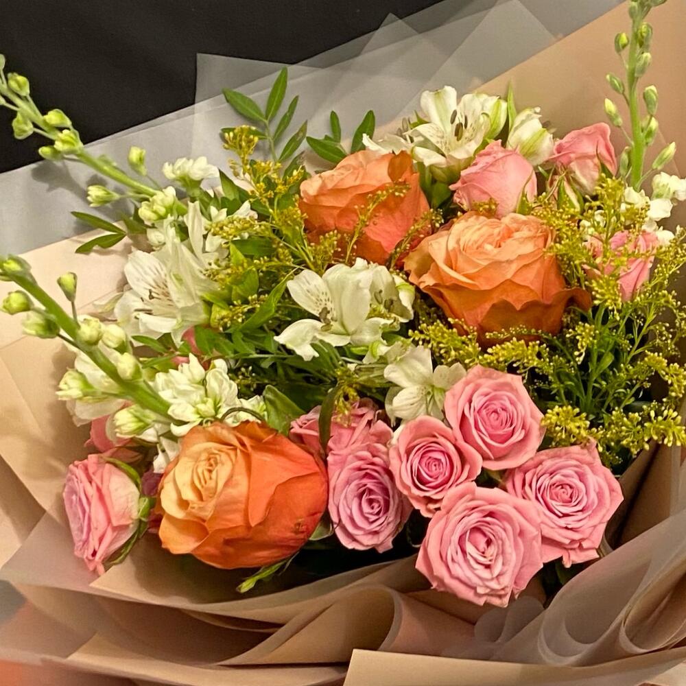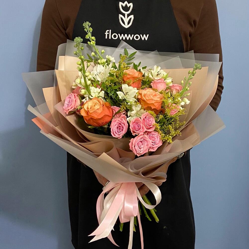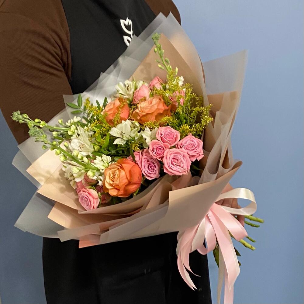 Нежный букет из розы, альстромерии, эустомы в стильной упаковке