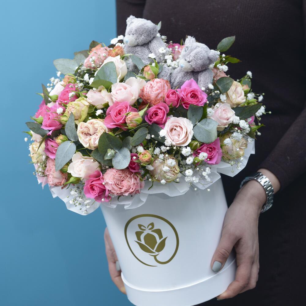 Мишки – 2 шт. кустовые розы – 31 шт. Гипсофила – 21 шт.