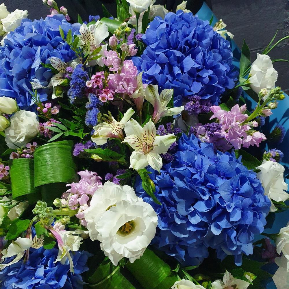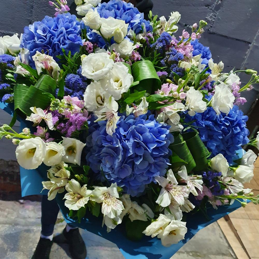 Гортензия синяя – 5 шт.Альстромерия – 10 шт.Статица – 10 шт.Лизиантус – 9 шт.Маттиола – 8 шт.Фисташка – 15 шт.Ваксфлауэр – 1 шт.Зелень – 15 шт.Упаковка дизайнерская – 3 шт.Лента атласная – 1 шт.Аспидистра – 4 шт.