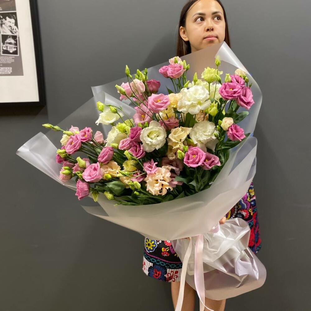 Букет из 15 белых и розовых эустом (лизиантусов) в стильной упаковке “Эландиэль”