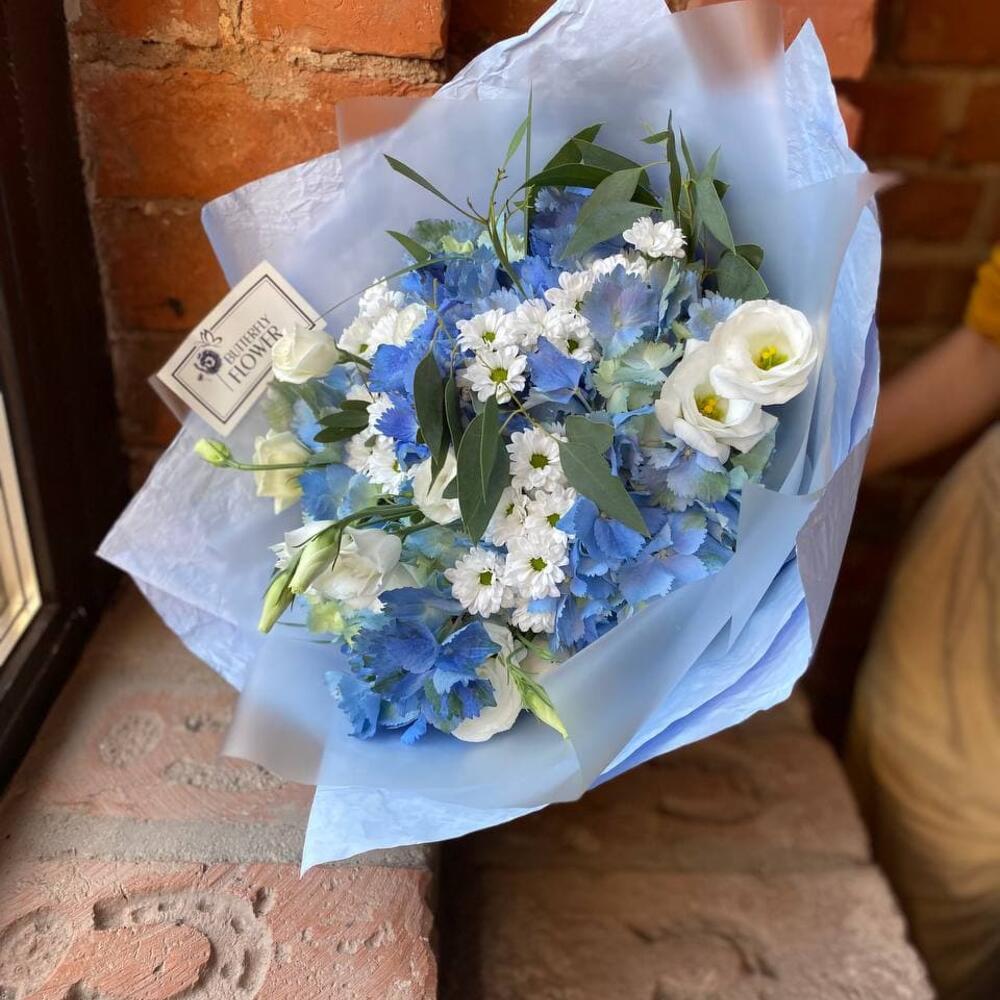 Букет из гортензии, эригниума, лизиантуса и роз "Сердце весны"