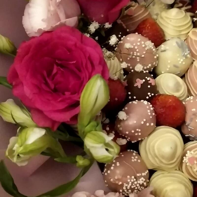 Альстромерия – 3 шт.Клубника – 8 шт.Лизиантус – 6 шт.Клубника в шоколаде callebaut (бельгия) – 30 шт.Дизайнерская упаковка – 1 шт.розы алые 60 см – 5 шт.