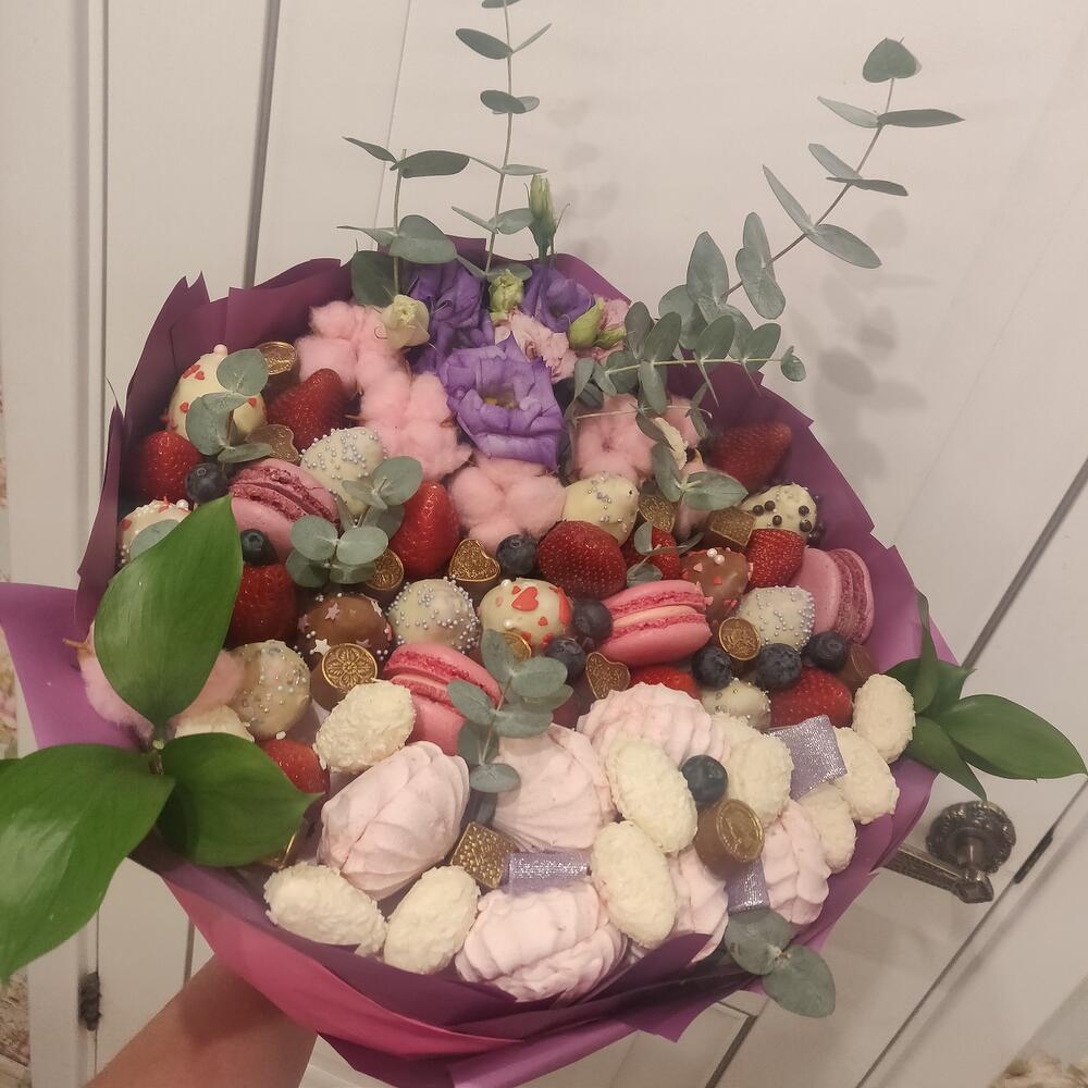 Клубника – 13 шт.Голубика – 10 шт.Лизиантус сиреневый – 4 шт.Хлопок натуральный – 7 шт.Лизиантус алиса пинк – 3 шт.макарон (пирожное) – 4 шт.Зефир клубничный – 6 шт.Клубника в шоколаде callebaut (бельгия) – 14 шт.зелень декоративная – 4 шт.конфеты кокосовые – 12 шт.транспортировочная упаковка – 1 шт.Упаковка дизайнерская – 1 шт.конфеты золотые – 16 шт.