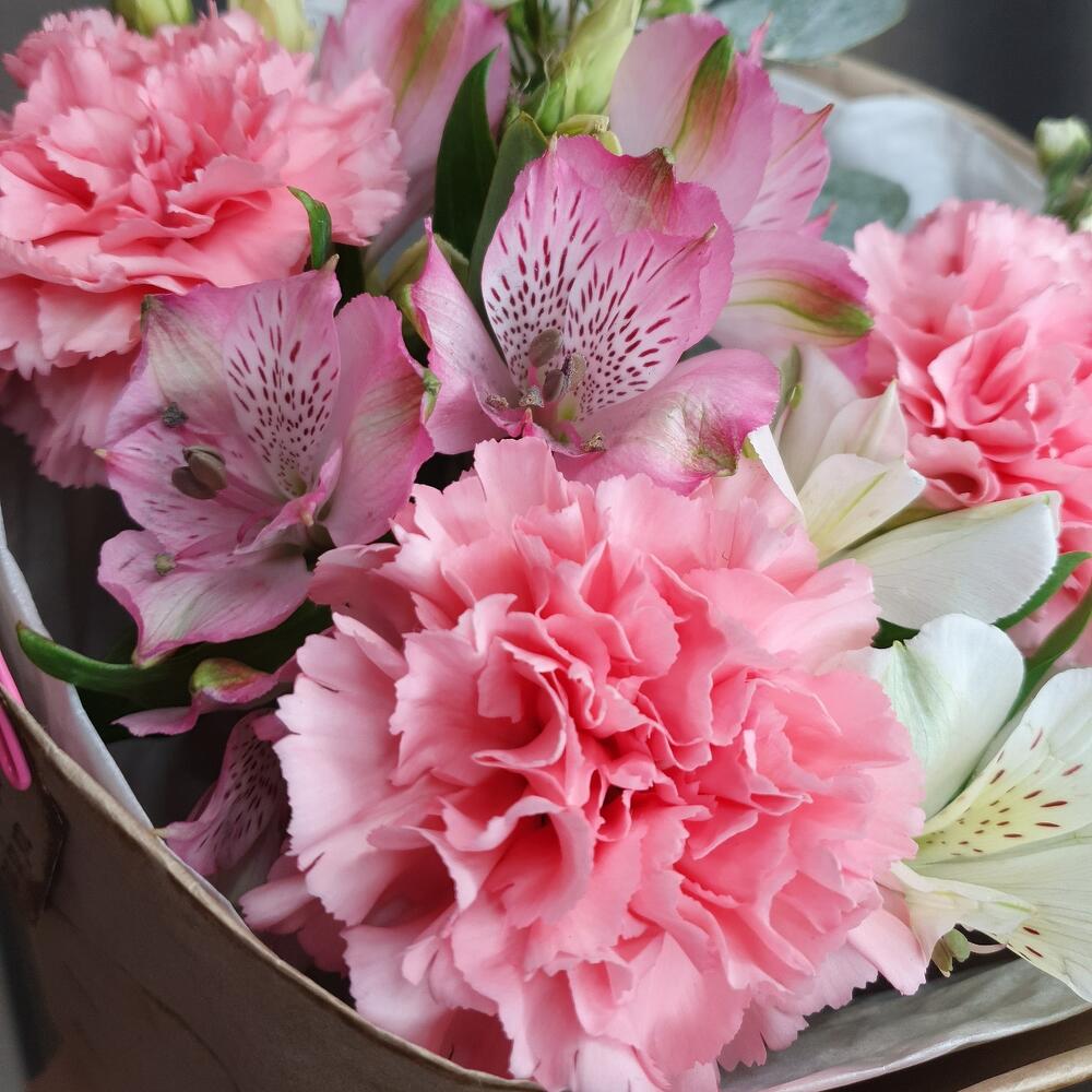 Альстромерия – 2 шт.Лизиантус – 1 шт.Тишью – 1 шт.Крафт упаковка – 1 шт.дипнтус – 3 шт.Эвкалипт – 1 шт.Ваксфлауэр – 1 шт.
