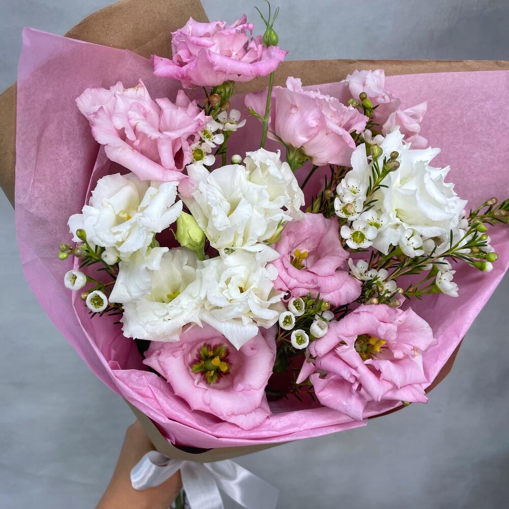 Лизиантус – 3 шт.Ваксфлауэр – 2 шт.Упаковка тишью – 1 шт.Упаковка крафт – 1 шт.Лента атласная – 1 шт.