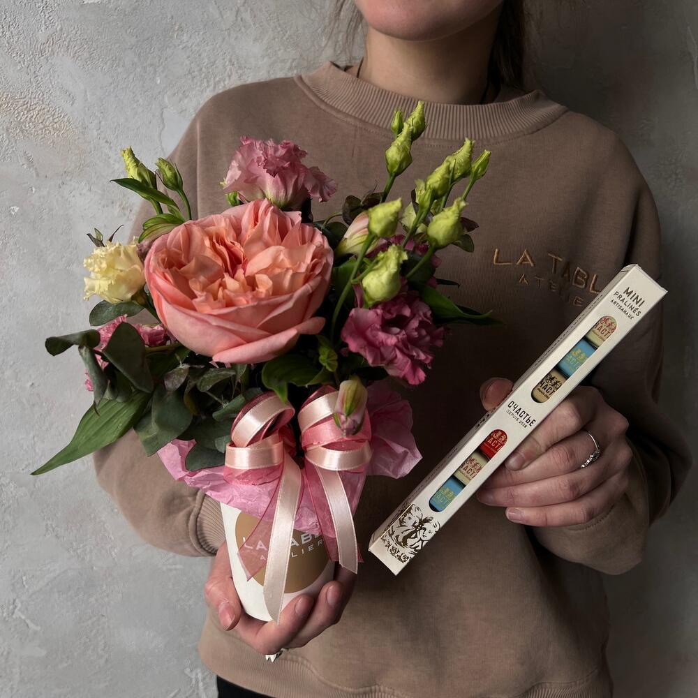 Альстромерия – 1 шт.Лизиантус – 1 шт.Эвкалипт – 1 шт.пинк экспрешн – 1 шт.стакан крафт – 1 шт.набор шоколада «счастье» – 1 шт.