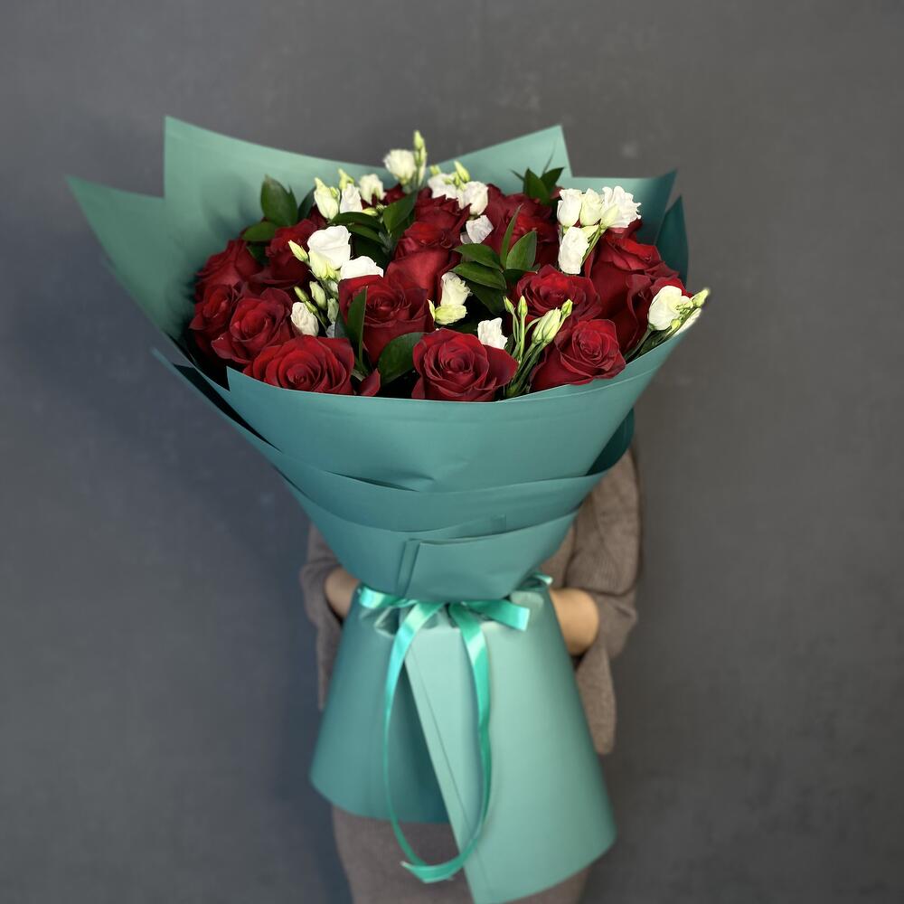 25 красных роз с эвкалиптом