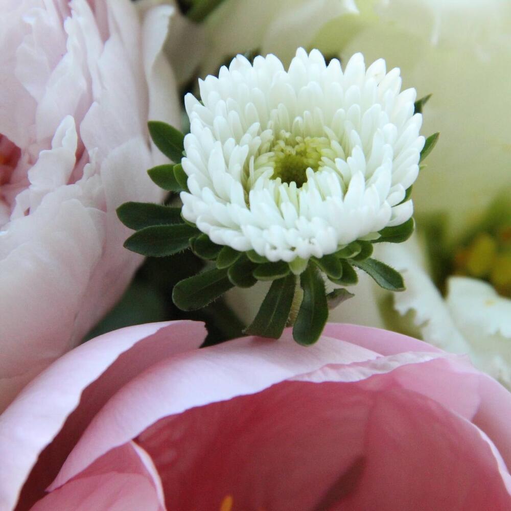 Пион – 7 шт.гербера кучерявая – 5 шт.Астра – 2 шт.Фисташка – 2 шт.Амми – 3 шт.Лизиантус – 3 шт.малина зелень – 2 шт.Эвкалипт – 3 шт.Упаковка – 1 шт.Лента атласная – 1 шт.