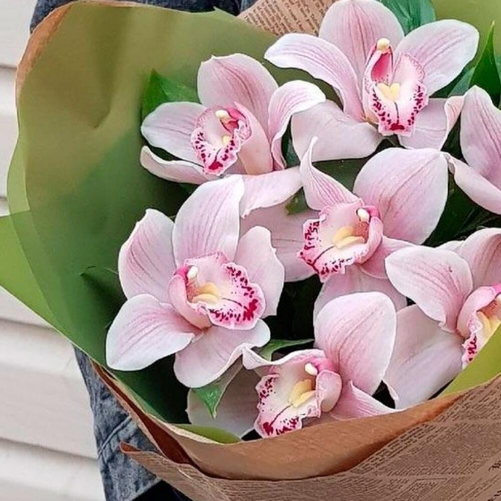 Орхидея Цимбидиум – 7 шт.Зелень – 5 шт.Лента атласная – 2 шт.Упаковка дизайнерская – 2 шт.