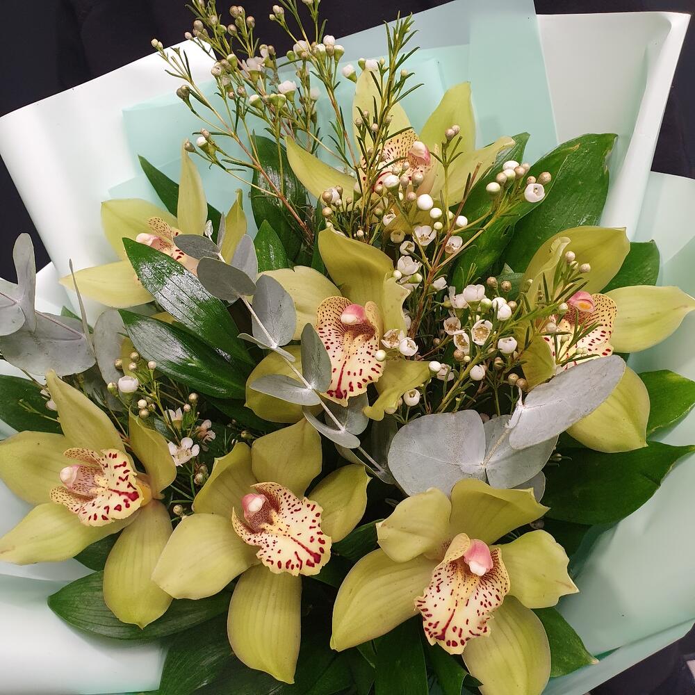 Орхидея Цимбидиум – 7 шт.Ваксфлауэр – 1 шт.Эвкалипт – 3 шт.Зелень – 10 шт.Упаковка дизайнерская – 1 шт.Лента атласная – 1 шт.