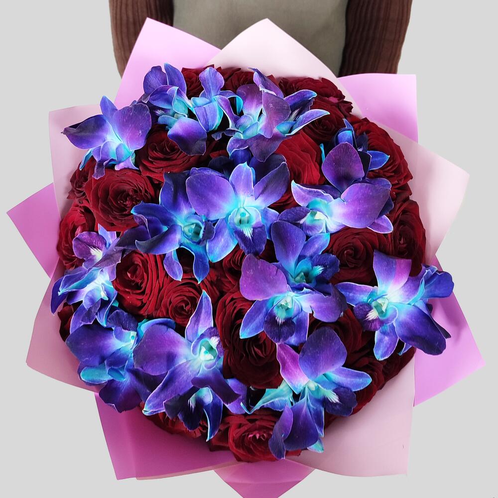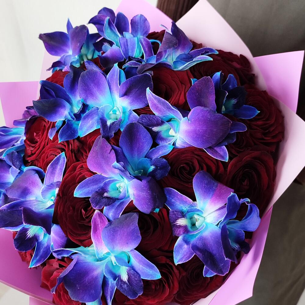 Красные розы с космическими орхидеями XL. Букет 142 ALMOND ROSES