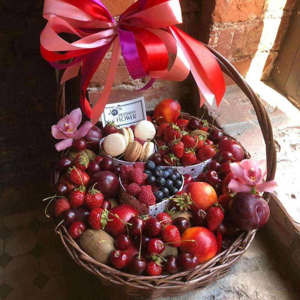 Корзинка с ягодами, фруктами и макаруни – идеальный подарок по любому поводу и вовсе без повода. Ведь все любят вкусняшки))Магазин оставляет за собой право на замену сезонных товаров и аксессуаров, если это не отразится на стоимости и внешнем виде композиции. Количество ягод указано в граммах.