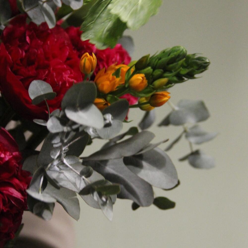 Лента – 1 шт.Пион – 9 шт.Эвкалипт – 7 шт.Орнитогалум – 2 шт.ирландский колокольчик – 2 шт.ветки аспарагуса – 3 шт.левкакендрон – 3 шт.