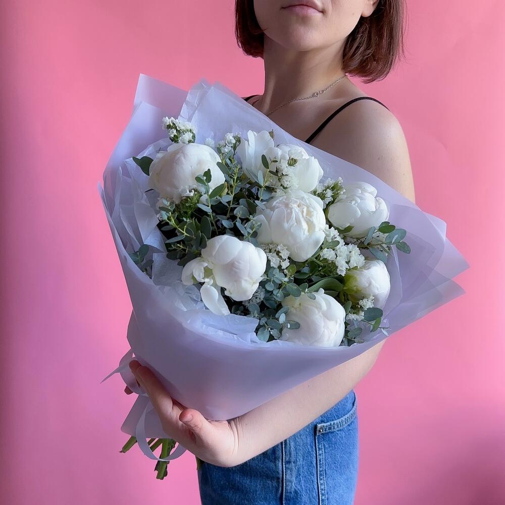 пионы – 7 шт.Статица – 3 шт.Эвкалипт – 2 шт.Упаковка дизайнерская – 1 шт.