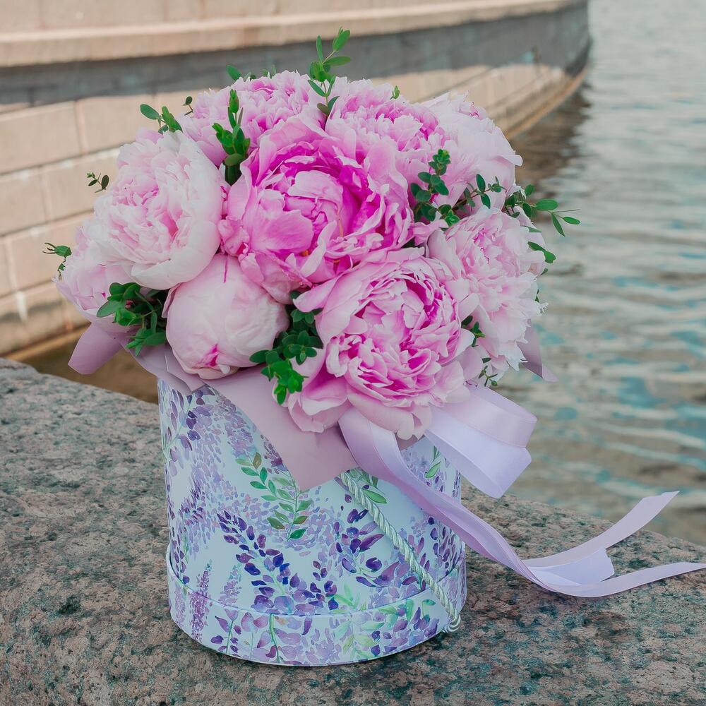 Пион – 25 шт.Атласная лента – 1 шт.зелень фисташки – 1 шт.шляпная коробка с оазисом – 1 шт.
