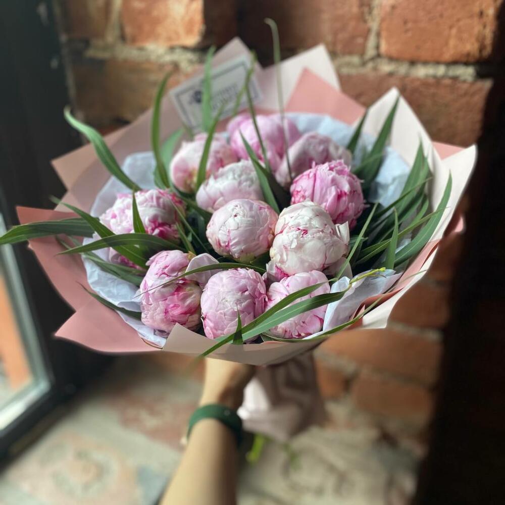 Букет из 11 пионов и эвкалипта в дизайнерской упаковке “Аромат пионового облака”